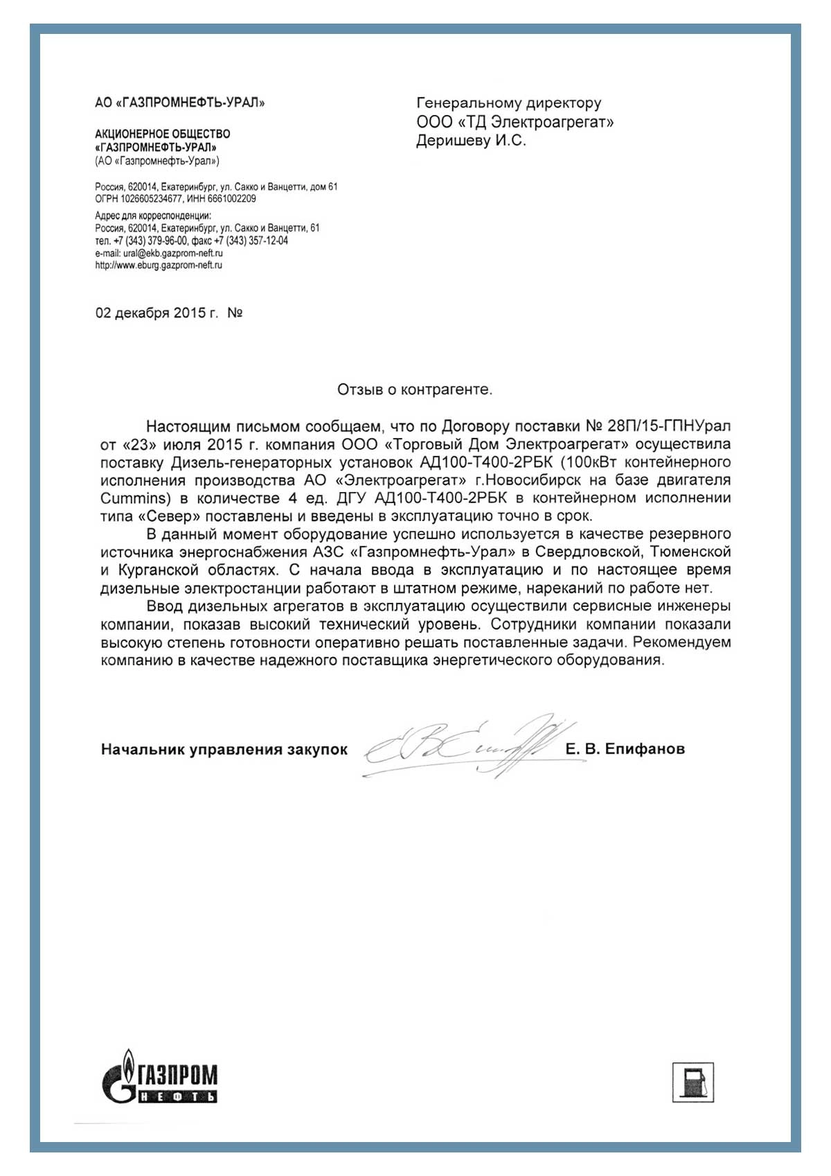 Настоящим письмом сообщаем, что по Договору поставки № 28П/15-ГПНУрал от «23» июля 2015 г. завод «Торговый Дом Электроагрегат» осуществила поставку Дизель-генераторных установок АД100-Т400-2РБК в количестве 4 ед. ДГУ АД100-Т400-2РБК в контейнерном исполнении типа «Север» поставлены и введены в эксплуатацию точно в срок.