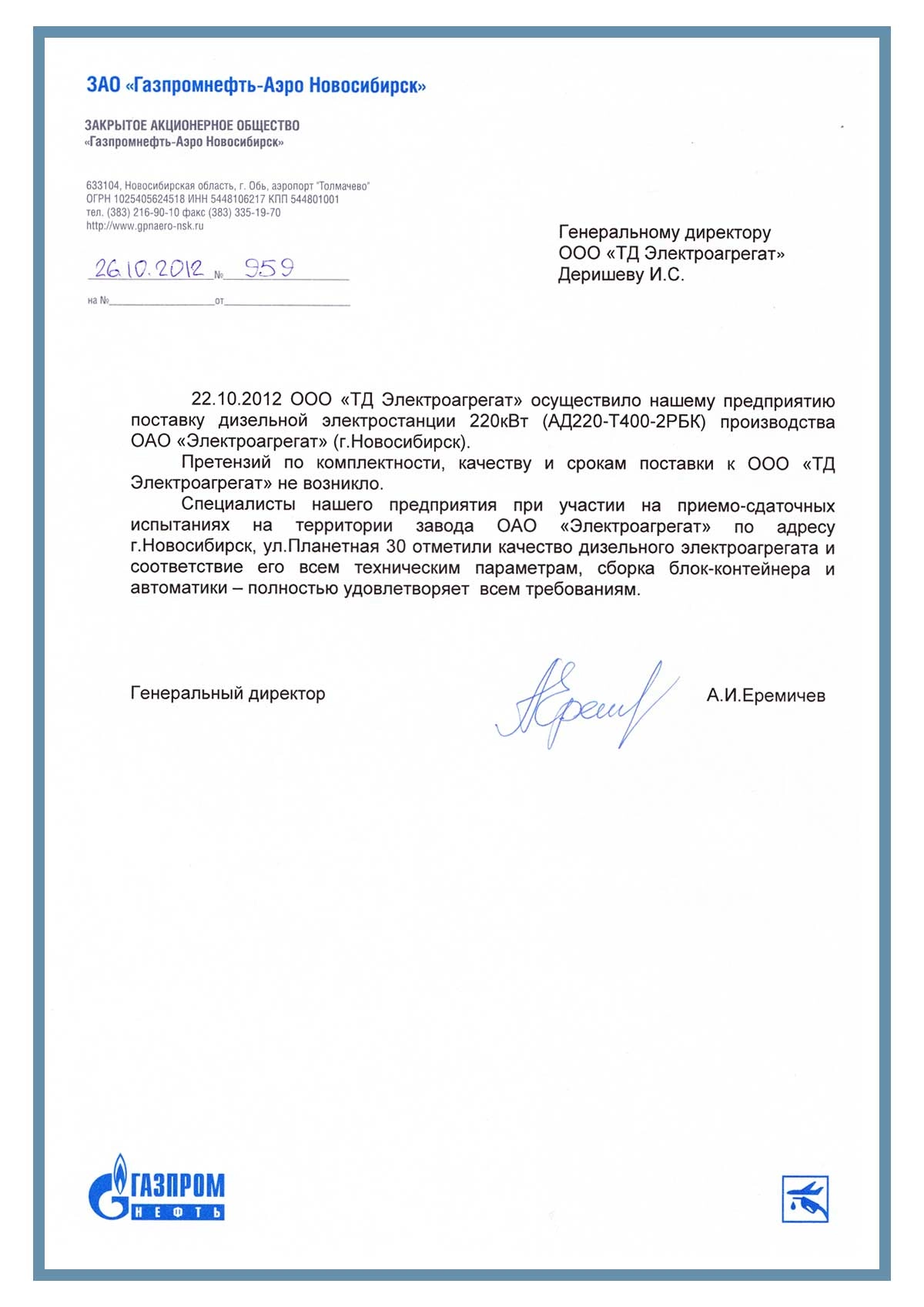 [ALT] => Отзыв контрагентов о компании ООО «ТД Электроагрегат» и исполненном проекте для ЗАО "Газпромнефть-Аэро Новосибирск" г. Обь
